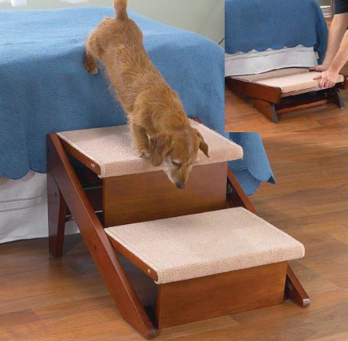 Features: Folds flat for storage. No assembly required. Perfect for aging or arthritic pets. Dimensions: 26"L x 17 1/2"W x 13"H. For skittish pets that won't use pet steps. Handle and steps that lock in place increase portability. Sturdy cherry-finished pine frame holds pets up to 130 pounds. Each step measures 12"D x 16"W and is covered with soft, non-slip, easy-clean carpeting. Innovative design converts steps into an easy-to-use ramp to make it effortless for pets to reach sofas, beds, and more.